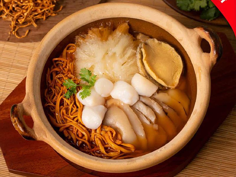 Được mệnh danh là “món ăn hoàng gia”, bào ngư kết hợp với đông trùng hạ thảo, nhân sâm, kỷ tử, táo đỏ và nấm hương tạo nên món ăn cực kỳ bổ dưỡng. Món này đặc biệt thích hợp cho người đang bị suy nhược cơ thể nặng, yếu sinh lý, sức đề kháng kém hoặc đang điều trị các bệnh mãn tính và cấp tính. Cách chế biến cần chú ý đun nhân sâm trước, sau đó mới cho các nguyên liệu khác vào theo thứ tự để giữ trọn dưỡng chất.
